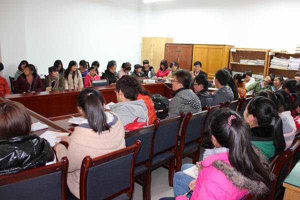 王书记以幻灯片的形式,利用图片、文字等方式向同学们全面展示了十八大会议的主要内容和会议要点,并对其一一解读分析。首先,王书记介绍了十八大的基本情况,让同学们对于党的十八大有个全面的了解和认识。其次,将胡锦涛同志在十八大所作报告按十二个重点部分依次讲解,着重分析了本次报告中的新概念、新表述、新提法等内容,让同学们对未来我国社会主义的全面建设方向和重点有所了解。