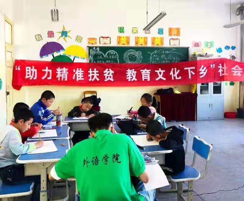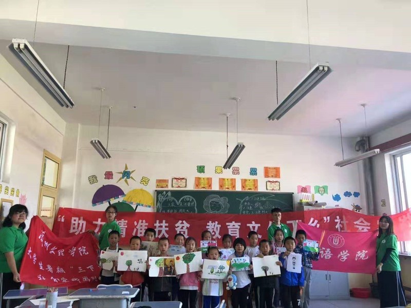 下午三时,队员武文凤、张弛进行了美术绘画教学,采用分组比赛的方式,指导员工独立完成作品且颁发小奖品。张弛和武文凤同学为明德小学绘制了教育扶贫文化墙,最后小分队为明德小学捐赠了图书以及文具,并和在校师生合影留念。
