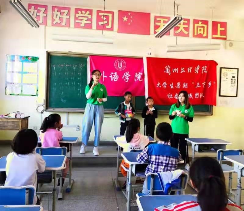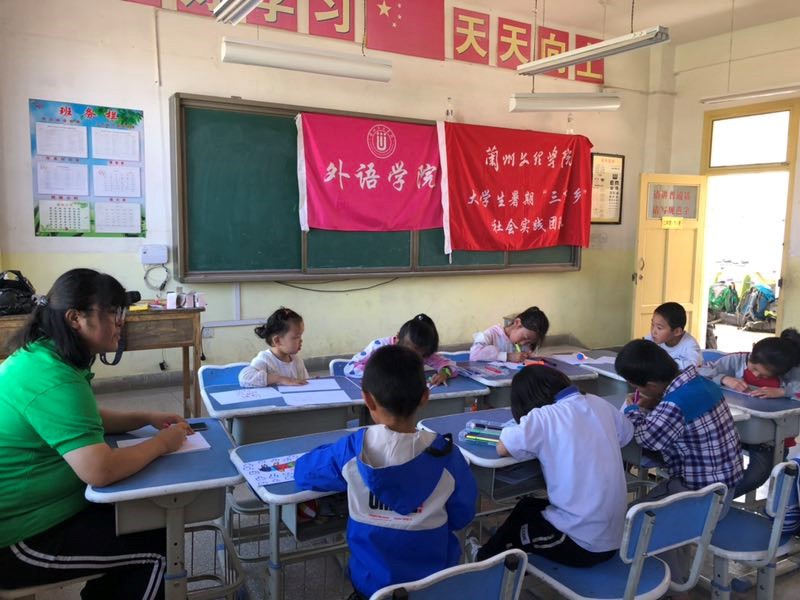 上午九时,队员杨兰兰、王莹雪对在校的小朋友进行了英语教学,通过教唱英文歌曲,做小游戏,奖品鼓励等方法调动了小朋友的积极性,效果显著。下午三时,队员武文凤、张弛进行了美术绘画教学,采用分组比赛的方式,指导员工独立完成作品且颁发小奖品。