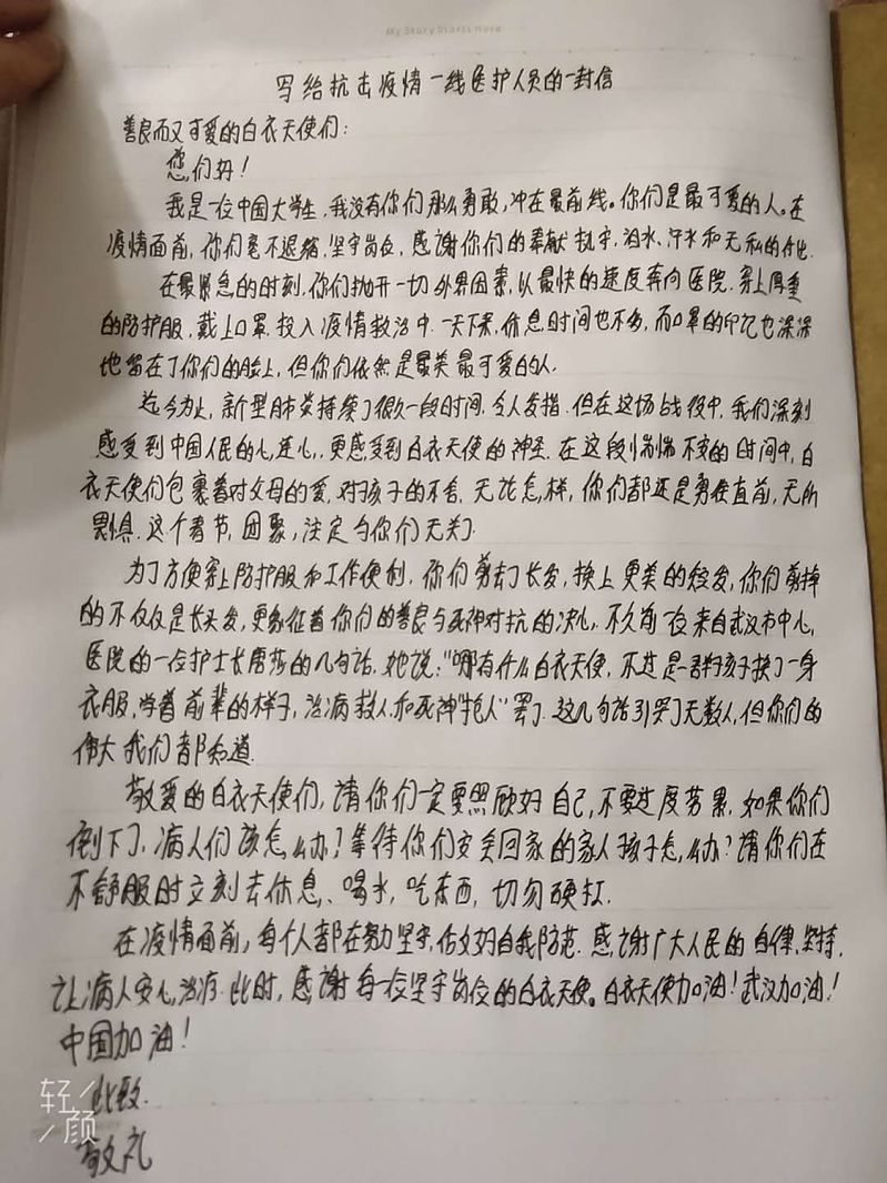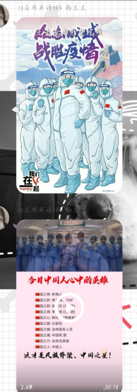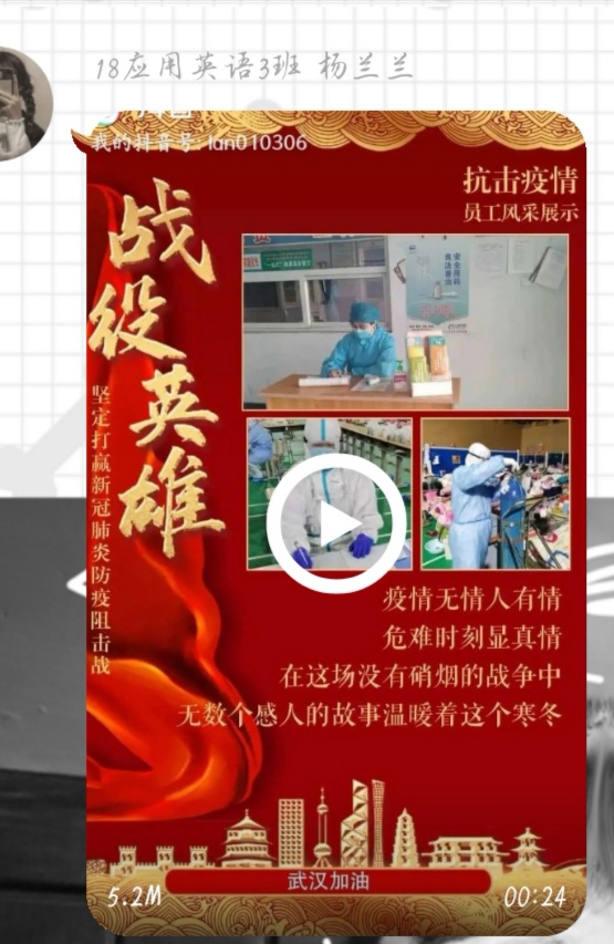 2018级应用英语三班团支部精心制作了《抗击疫情,致敬英雄》微视频,同学们以接力的方式开展了为武汉加油,为中国加油的主题拍照,并为奋斗在一线的白衣天使写了祝福信。其团日活动的有序开展,展现出懂球体育学子作为新时代青年,心系武汉,心系国家的社会责任感。