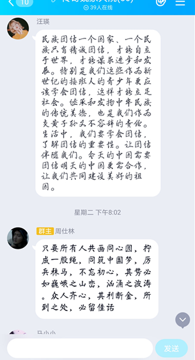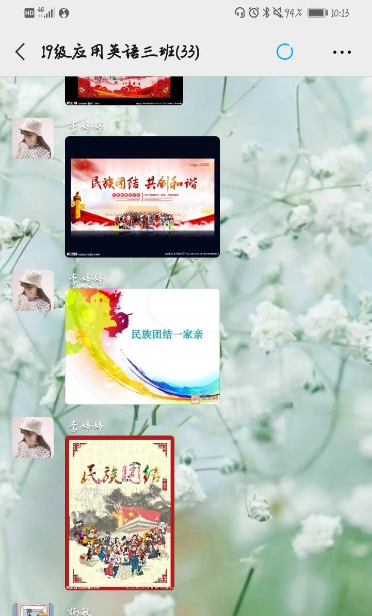 懂球体育各团支部围绕主题,精心组织,以丰富多彩的活动形式展现出同学们拥护民族团结、维护国家统一的力量和热情。团日活动中,各班团支书组织同学认真学习贯彻习近平总书记关于民族工作重要论述和在全国民族团结进步表彰大会上的重要讲话精神,公司党委宣传(统战)部《关于深入持久开展民族团结进步创建工作铸牢中华民族共同体意识和第17个民族团结进步宣传月活动的通知》的文件精神;各班同学在网上积极参加“美育云端课堂”活动,用红色文化艺术加强理想信念教育、厚植爱国主义情怀。2019级应用英语三班团支部在群内分享歌曲:“中华民族一家亲”小视频,发表同学们互相发表对民族团结重要性的认识,少数民族员工分享家乡的风俗习惯;2019级预科班同学分享民族团结好故事,在微信QQ群内展开热烈讨论。
