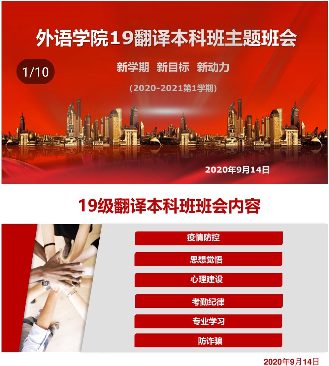 2020914日(星期一)上午10点,19级翻译本科班班主任曹玲老师组织全班同学在1-401教室召开了本学期第一次班会,曹老师就本次班会主要内容提前制作了PPT,班会主要围绕疫情防控、思想觉悟、心理建设、考勤纪律、专业学习和防诈骗六个方面进行。
