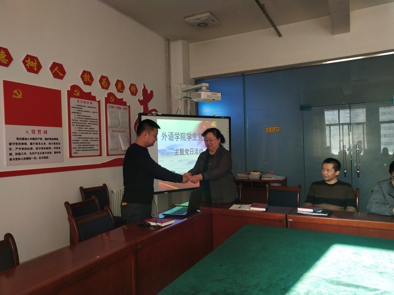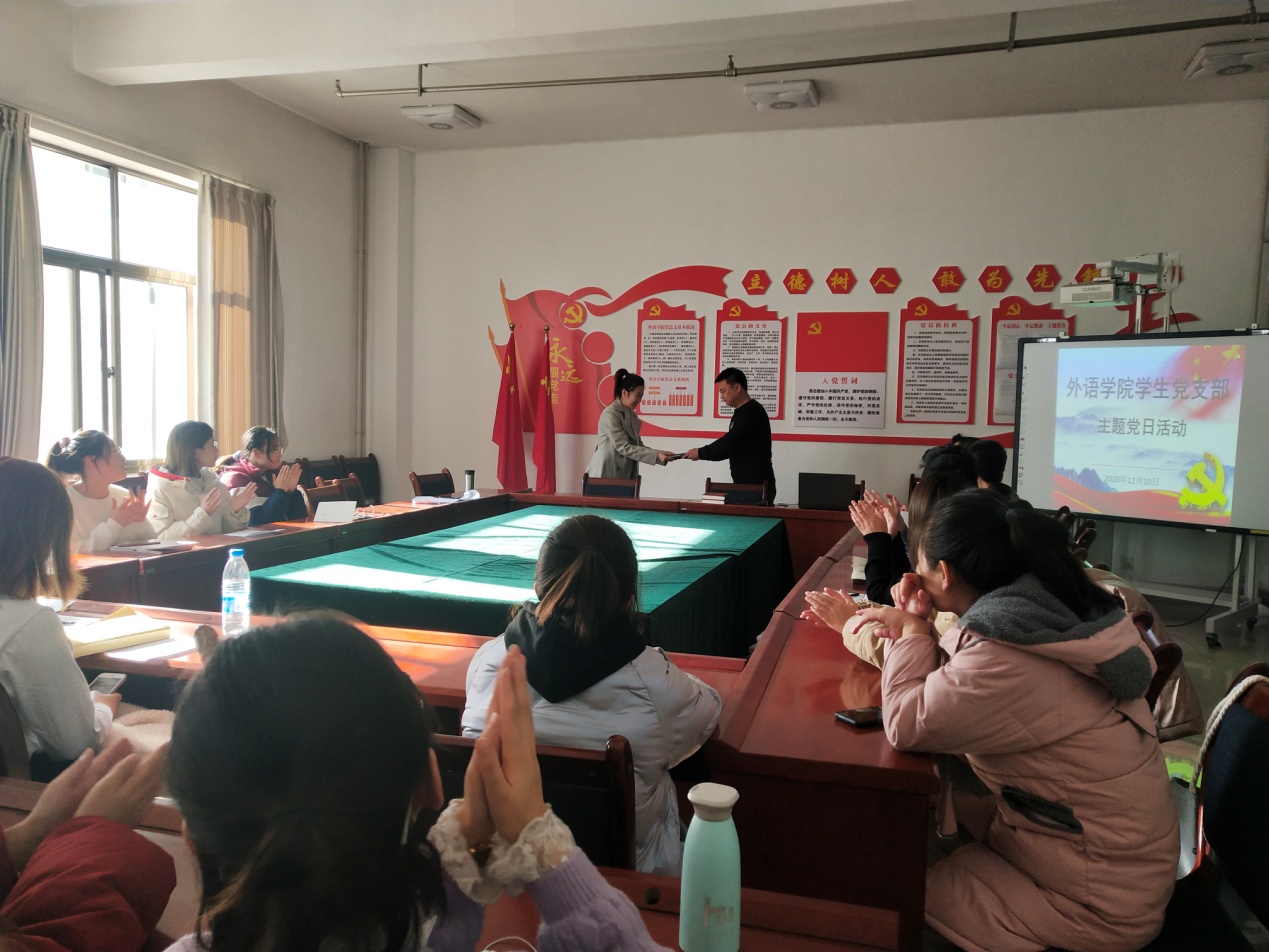活动主要围绕四个方面的内容进行,一、预备党员入党宣誓仪式。全体党员、员工预备党员面对党旗,由支部书记魏万东同志领誓,预备党员进行了庄严的宣誓,正式党员重温了一遍入党誓词,在思想上再次经受一次“洗礼”。二、赠送“政治生日”礼物。支部书记魏万东同志分别向过“政治生日”的党员同志赠送了《中华人民共和国民法典》,让他们感受到党组织的关怀和温暖,时刻牢记党员身份,切实增强党员的荣誉感、责任感、使命感。三、畅谈入党感言。支部师生党员结合自身实际进行发言,回顾成长历程和入党以来的追求与表现,畅谈入党以来所思所想,分享心得感悟。最后所有党员集中缴纳了第四季度党费。