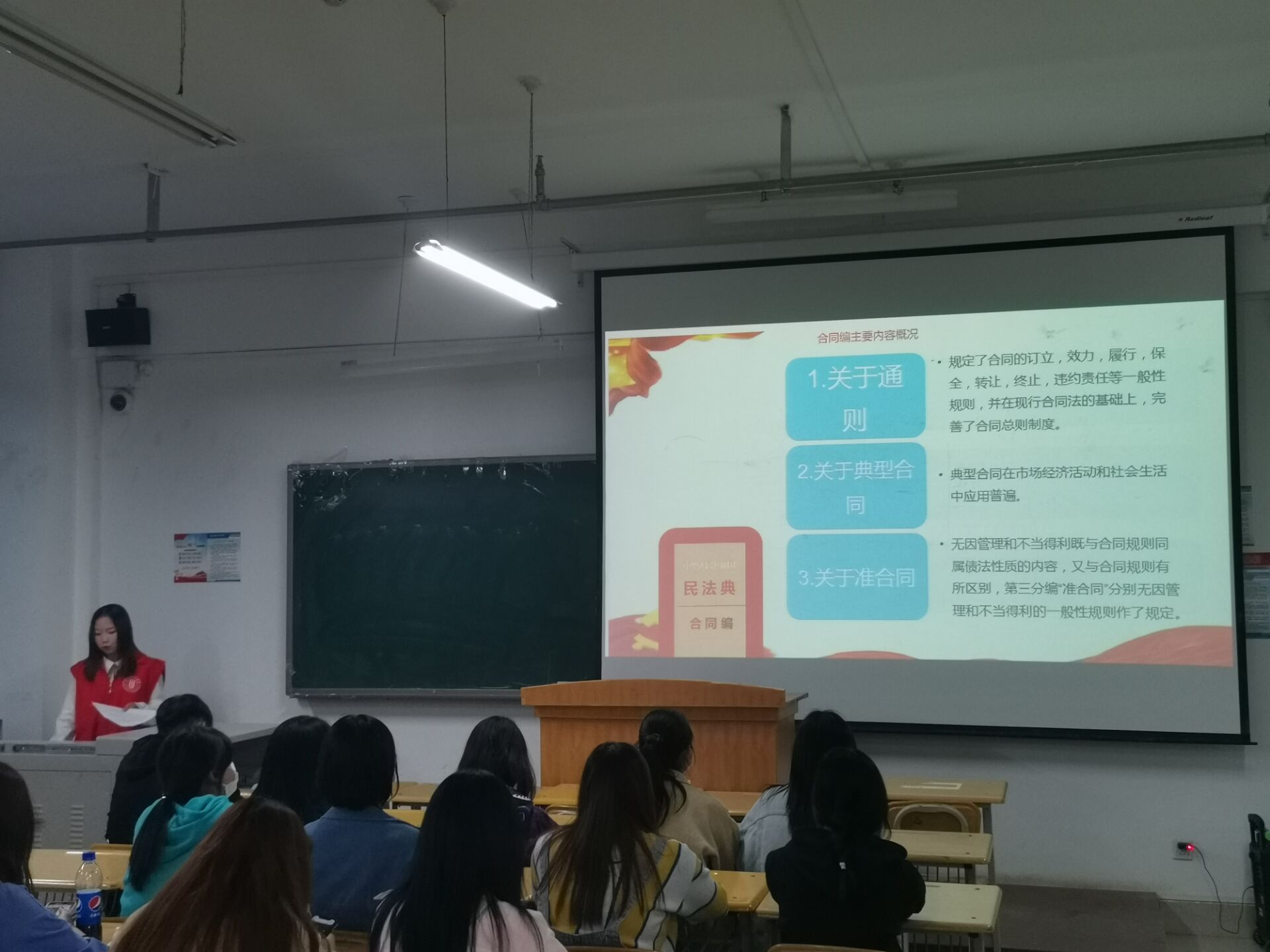 活动期间,三名普法志愿者与大家共同学习《民法典》,现场以提问的形式和同学们互动交流,就“《民法典》”基本知识、“在法律上你属于什么人?将自己的钱无偿捐赠可以吗?给主播打赏、游戏充费可以吗?”等目前热门问题展开互动,整个活动现场气氛热烈,纪律良好,每一位同学都怀着对法律的敬畏心和对生活的热情参与活动,认真学习法律知识。