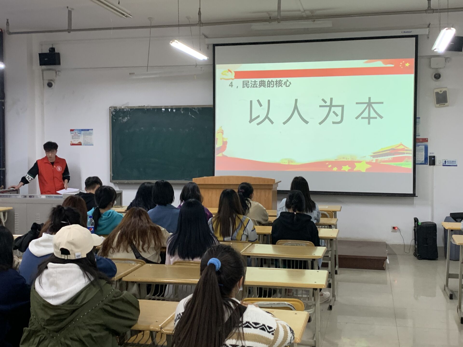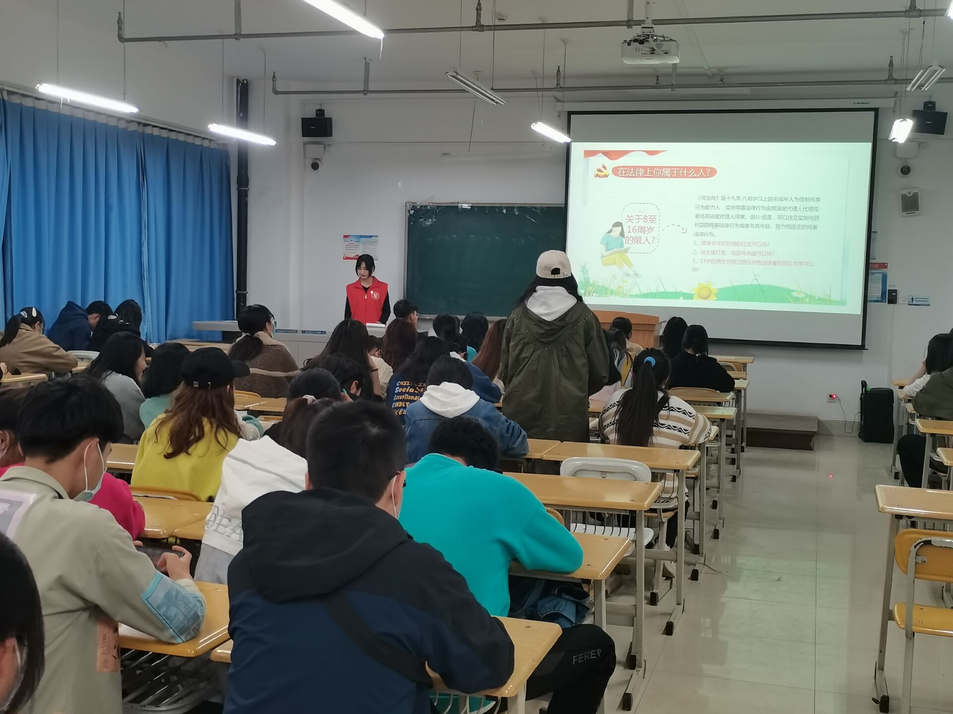 活动期间,三名普法志愿者带头学习《民法典》做了充分的准备,在向大家讲解的同时以提问的形式和同学们互动交流,就“《民法典》”基本知识、“在法律上你属于什么人?将自己的钱无偿捐赠可以吗?给主播打赏、游戏充费可以吗?”等问题展开提问互动,整个活动现场气氛热烈,纪律良好,每一位同学都怀着对法律的敬畏心和对生活的热情参与活动,认真学习法律知识。