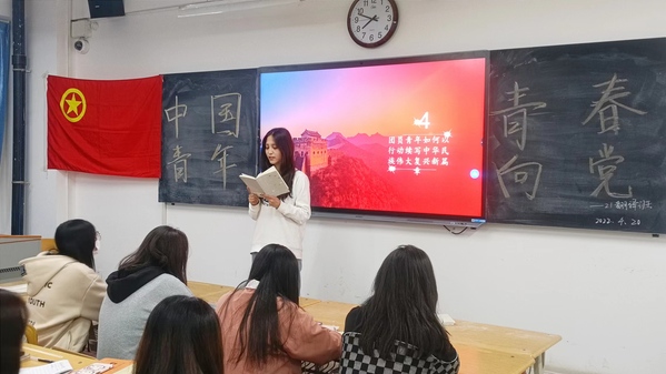 今年是建团百年,也是二十大召开之年,为深入学习中国青年运动的百年历程,教育团员青年清楚认识共青团组织和发展脉络,4月20日晚七点半,2021级翻译班在3-306教室开展主题团日活动,活动由团支部书记刘美洁主持。