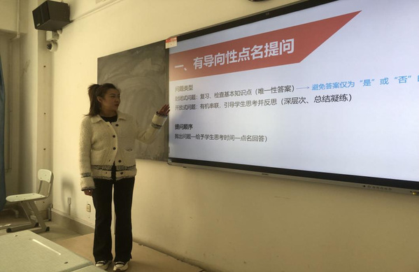 汇报过程中,张梓尧分别从“如何做到有效提问之有导向性点名提问”、“教学过程中形成性评价的作用”、“如何开发并利用教学资源工具包”等方面,就积极教学法在教学实践活动中的具体应用,向老师们展示了教学资源和相应成果,并分享了培训心得体会和反思收获。