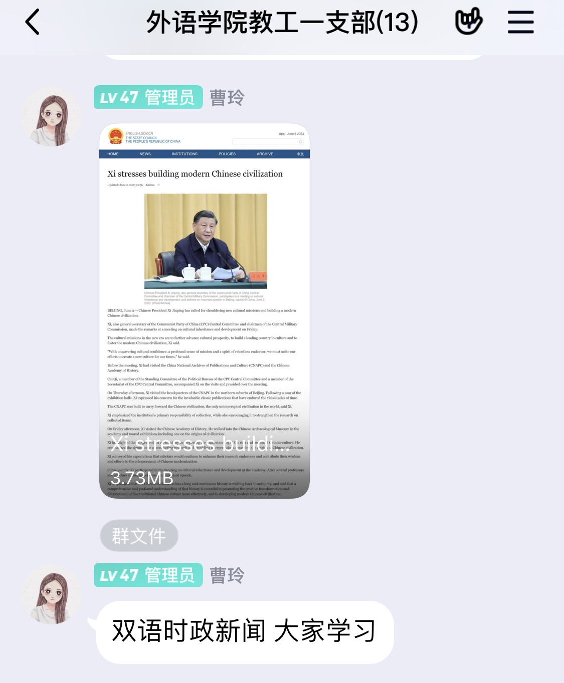 6月27日,员工党支部召开会议,党员教师孟晶以双语形式领学了《习近平致首届文化强国建设高峰论坛的贺信》,并对“推进文化自信自强,促进文明交流互鉴”的主题进行了解读。支部党员不仅认真学习了政治理论知识,同时也提升了翻译技能,拓宽了员工专业知识学习的领域。