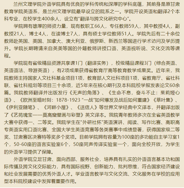 懂球体育是公司历史最悠久的院系之一。公司现有翻译本科专业一个,应用英语专科专业一个。