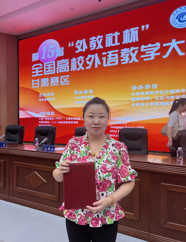 “外教社杯”全国高校外语教学大赛甘肃赛区比赛由甘肃省教育厅主办,每两年举办一届,已经连续举办15届,是我省水平最高、最具认可度、最具影响的专业赛事。本届比赛,来自全省19所本科院校的37位选手分专业英语组、商务英语组参赛。经过紧张激烈的角逐,公司教师朱钰脱颖而出,成功晋级第二轮比赛,并最终获得商务英语组二等奖。